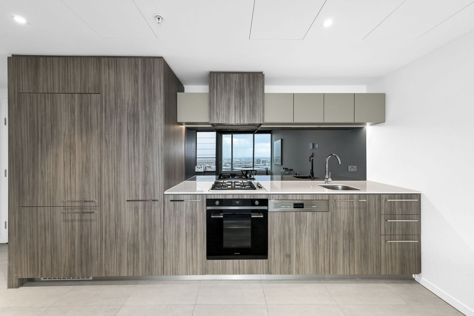 - Kitchen area with Smeg appliances and dark toned splashback