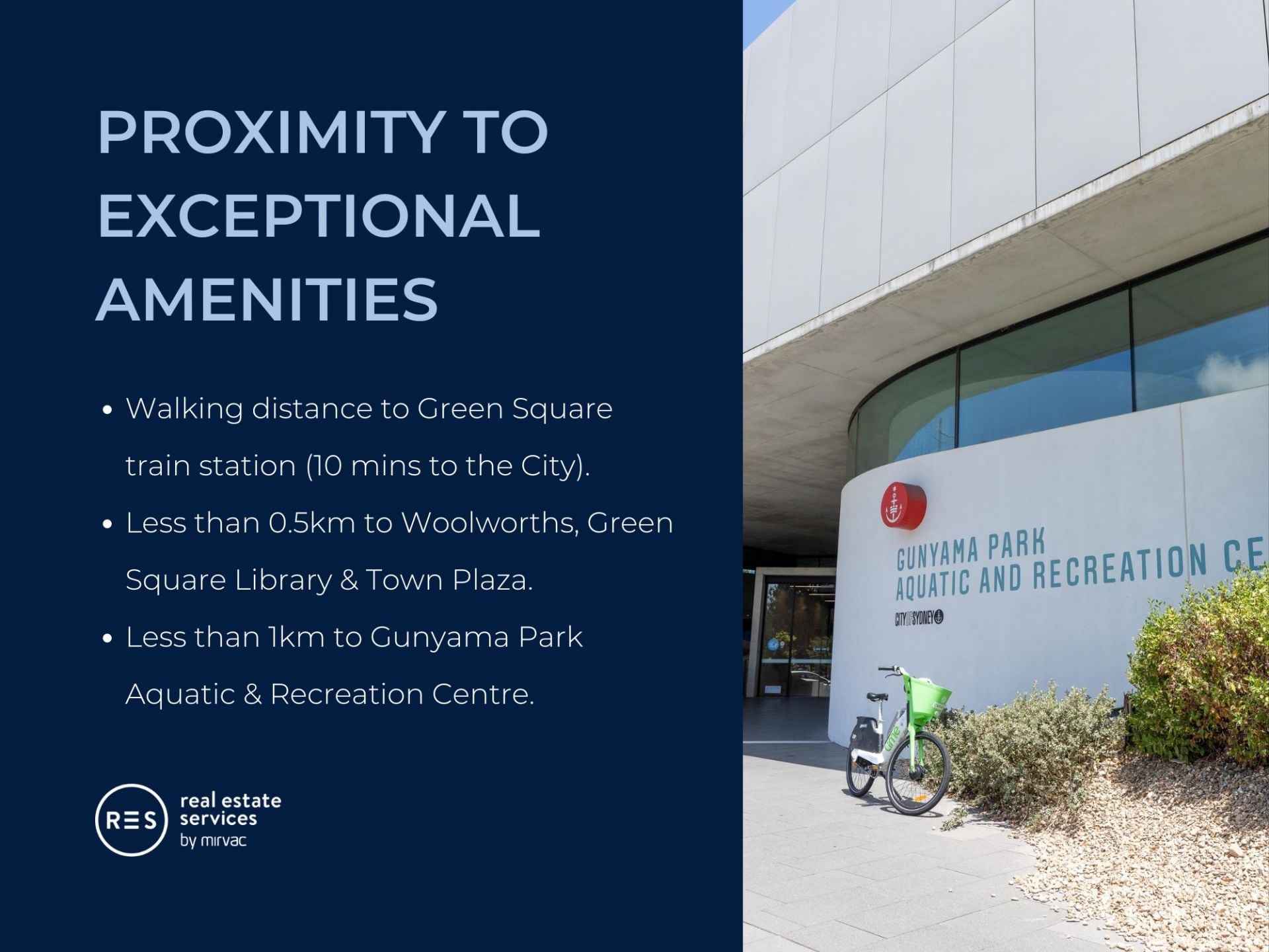 - 300m to Woolworths, Green Square Train Station (10mins to the City) + Library and 650m to Gunyama Park Aquatic and Recreation Centre