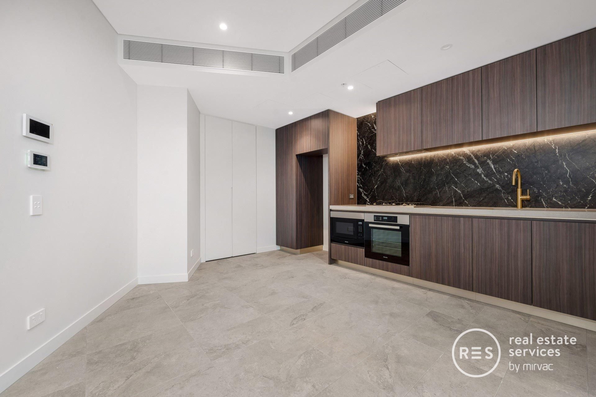 - Sleek kitchen with stone benchtops and integrated appliances