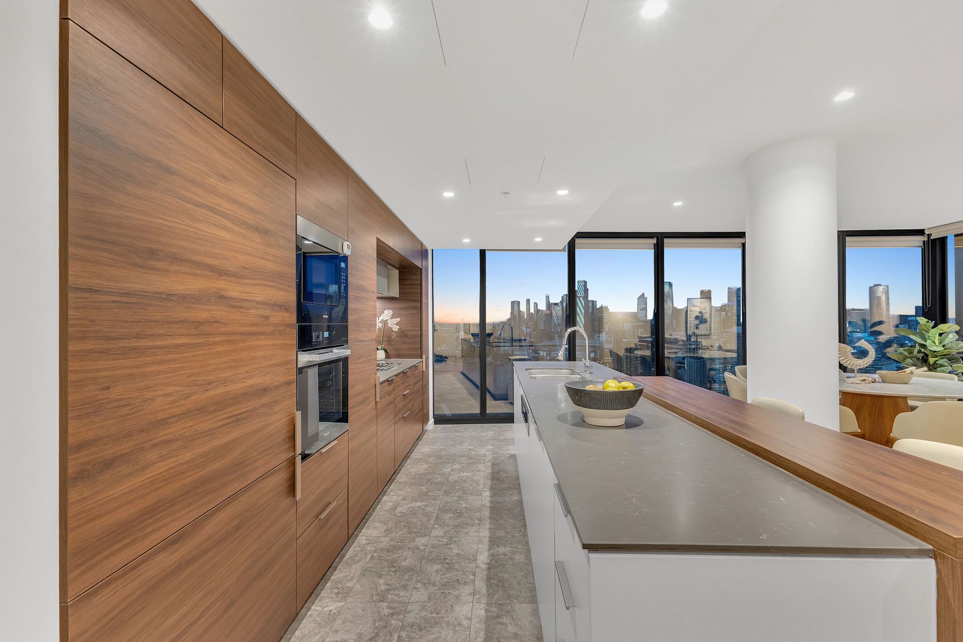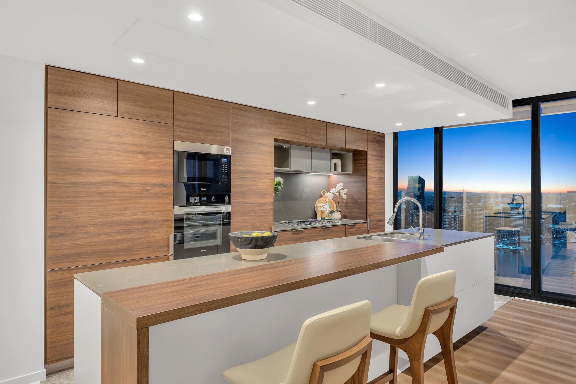• Gourmet kitchen with large stone benchtops, Miele appliances, gas cooktop, built-in fridge, microwave, and coffee machine