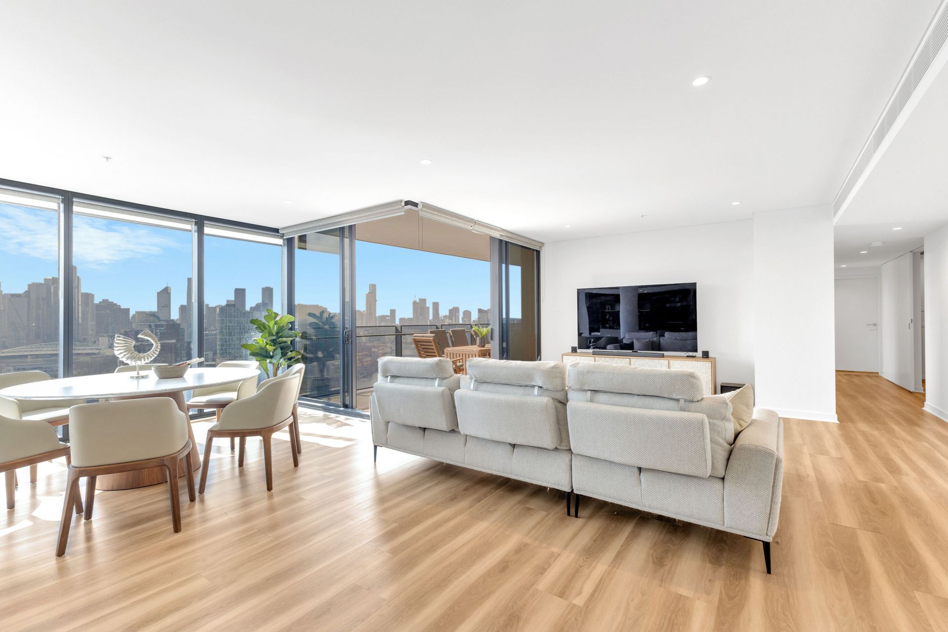 • Open-plan kitchen and spacious living/dining area extending to an oversized balcony