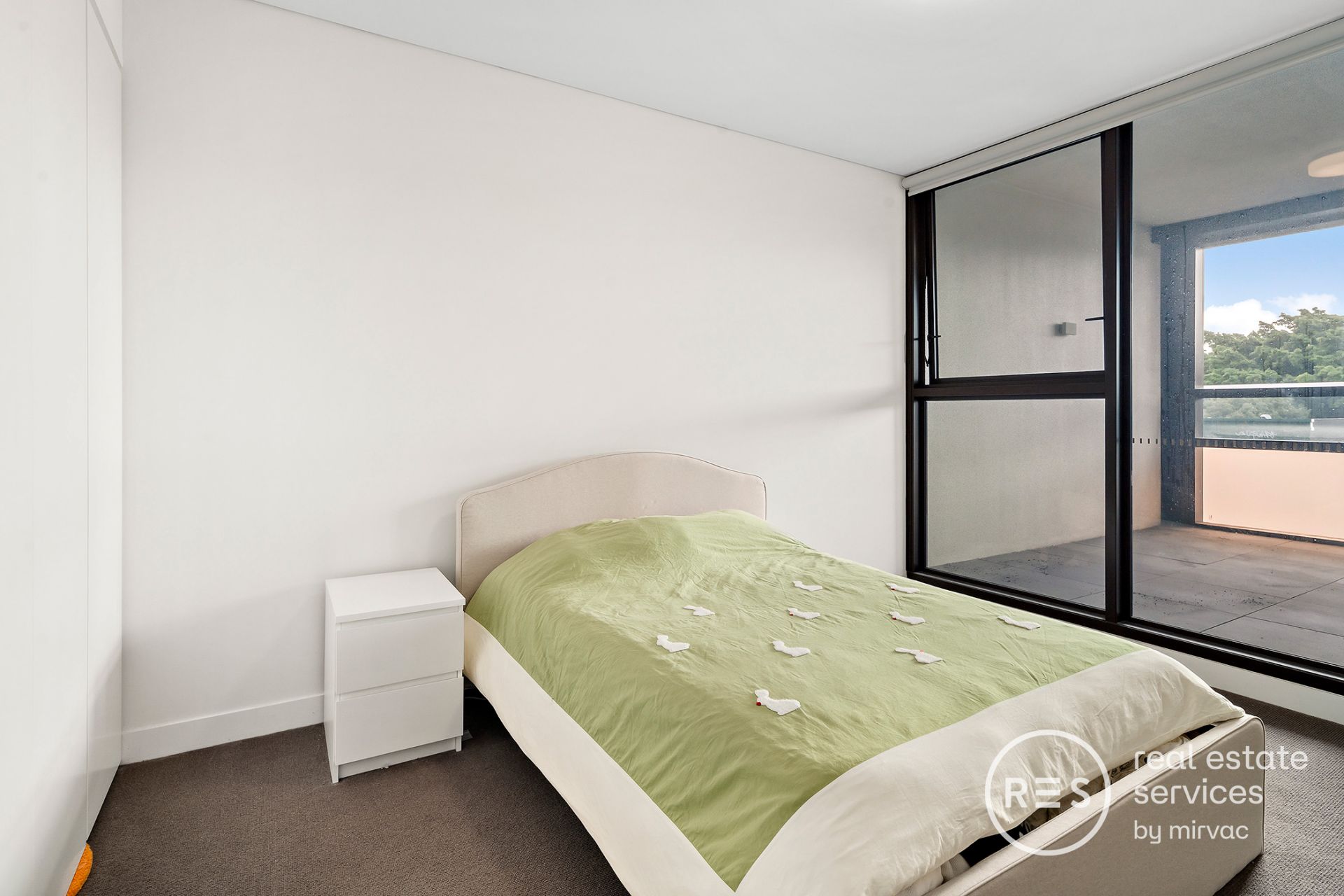 • Spacious bedroom with built-in wardrobe and soft natural light