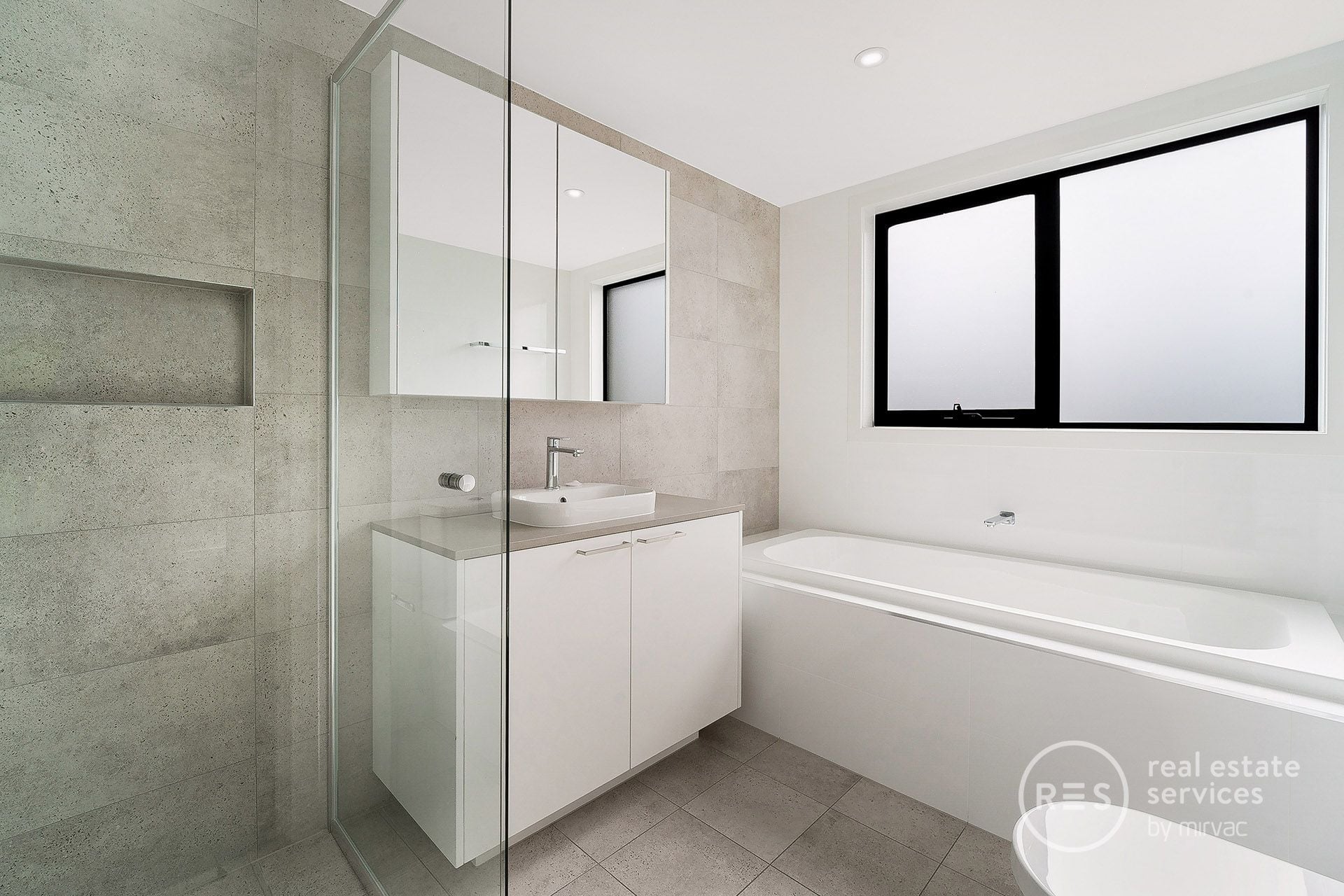- Sleek bathroom with bathtub and plenty of storage