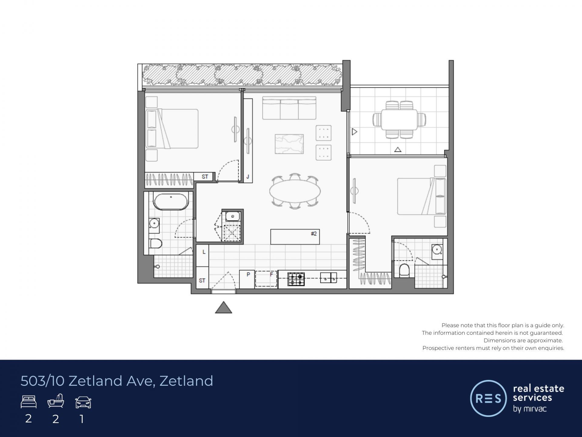 - Sunlit North facing balcony, accessible from both the master bedroom and living space