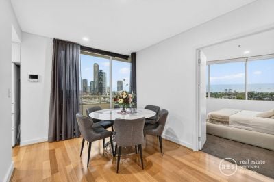 Soaring above Melbourne's skyline, this beautifully renovated Yarra's Edge residence delivers generous space, refined comfort and uninterrupted views stretching from the Yarra River and CBD to Port Phillip Bay. Sun‑drenched interiors, contemporary finishes and multiple balconies create an exceptional inner‑city retreat in one of Docklands' most desirable waterfront precincts.