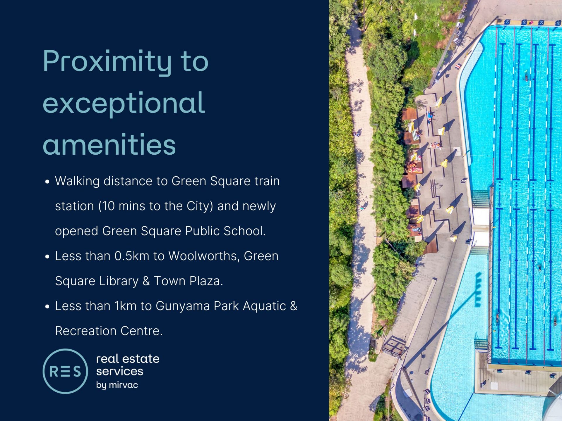 Here in Green Square you will find yourself located within minutes of cafes, shops, public transport and award winning amenities such as the new Gunyama Aquatic and Recreation Centre and Green Square Library.
