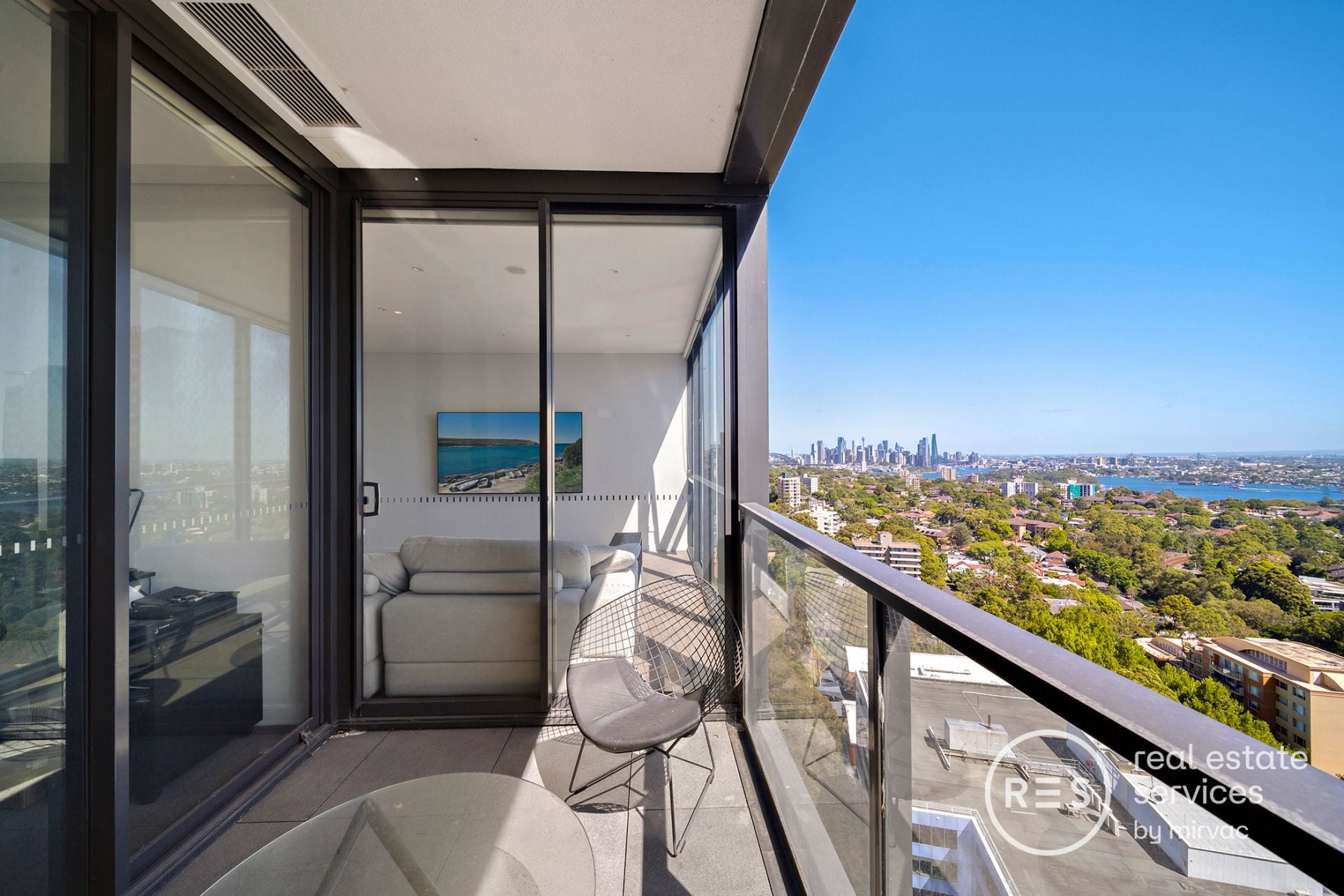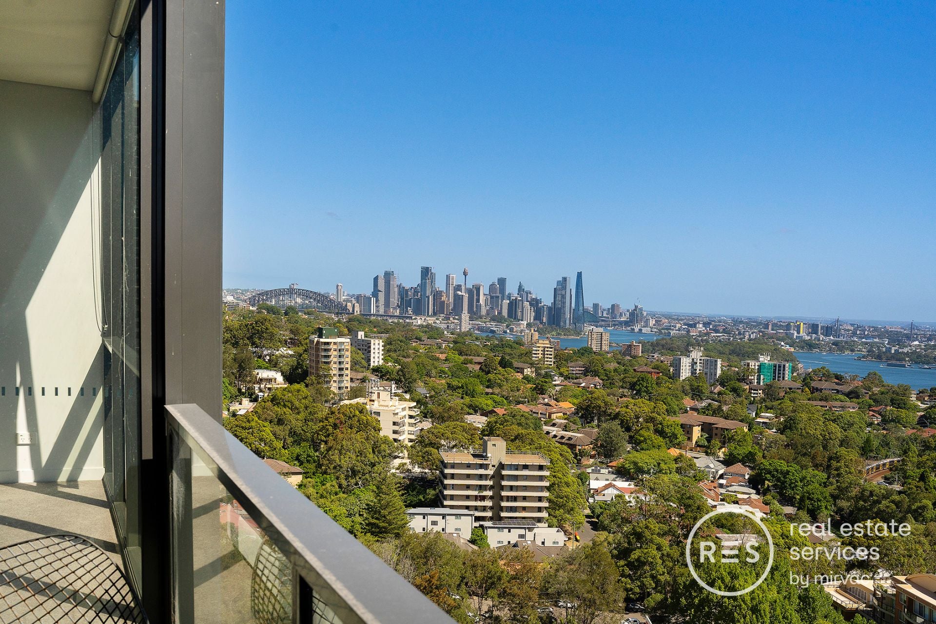 · Balcony with Harbour Bridge, city skyline and blue water vistas