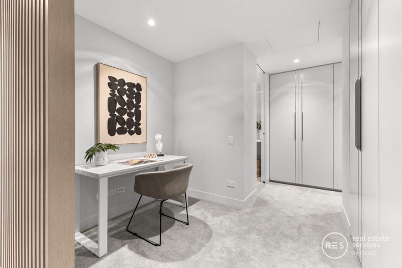 Expressing a strong sense of luxury, detail and durability over 123m2 internally and 17m2 externally (both approx.), the substantially sized and extensively robed bedrooms are serviced by a pristine pair of sleek bathrooms graced with floor-to-ceiling tiles, concealed cisterns, and rainfall/hand-held shower fittings. The property is further enriched by an opportunity to work from home in a privately placed study.